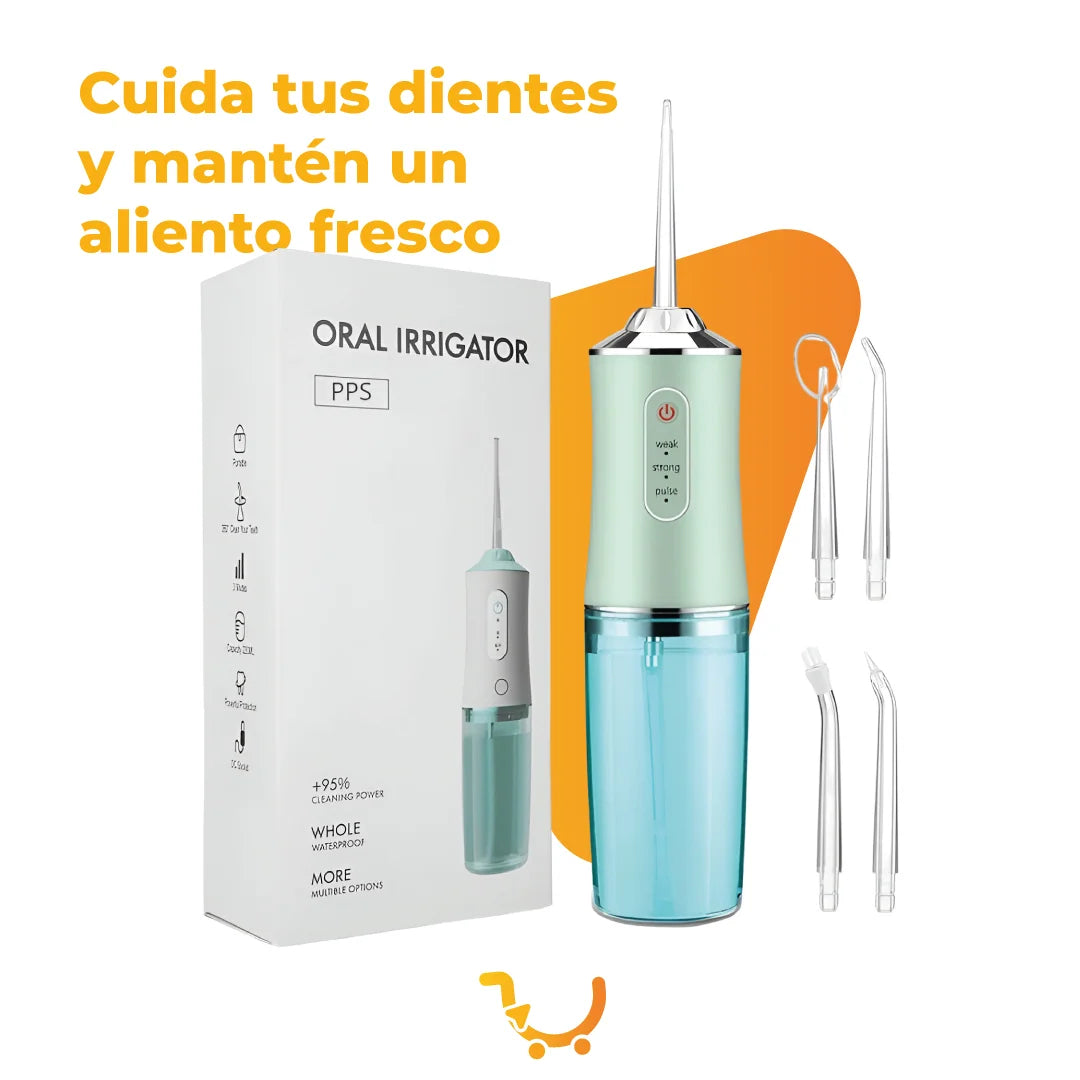 - Irrigador dental portátil con chorro de agua de alta presión para limpiar profundamente entre los dientes y las encías.