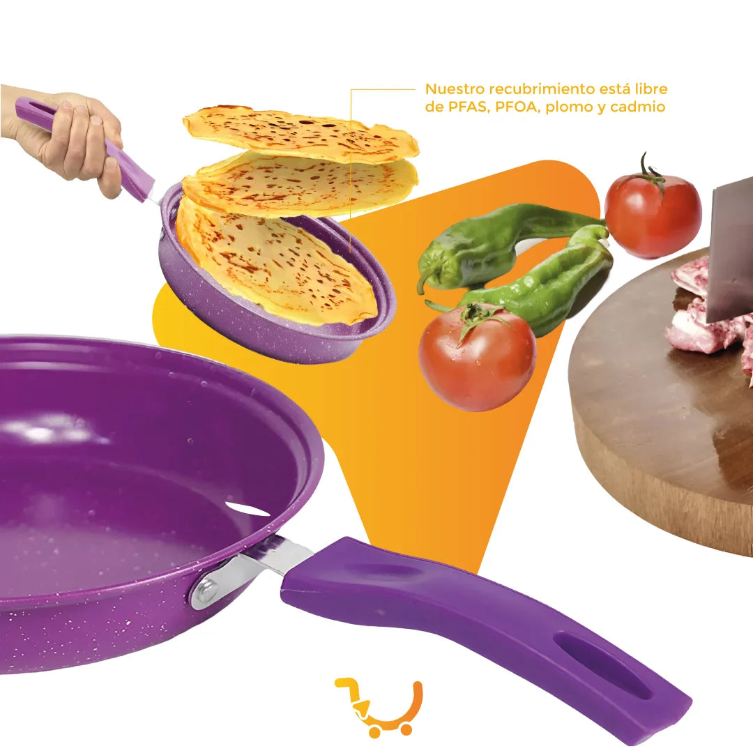 - Diseño moderno en color púrpura con mangos y tapas seguras, ideales para uso diario.