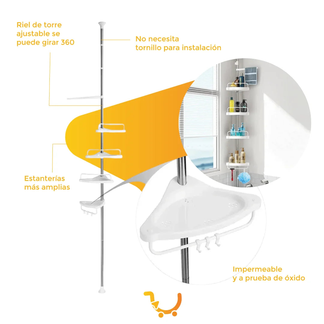 - Estanterías espaciadas y soportes adicionales para mantener los productos organizados y al alcance dentro de la ducha o bañera.