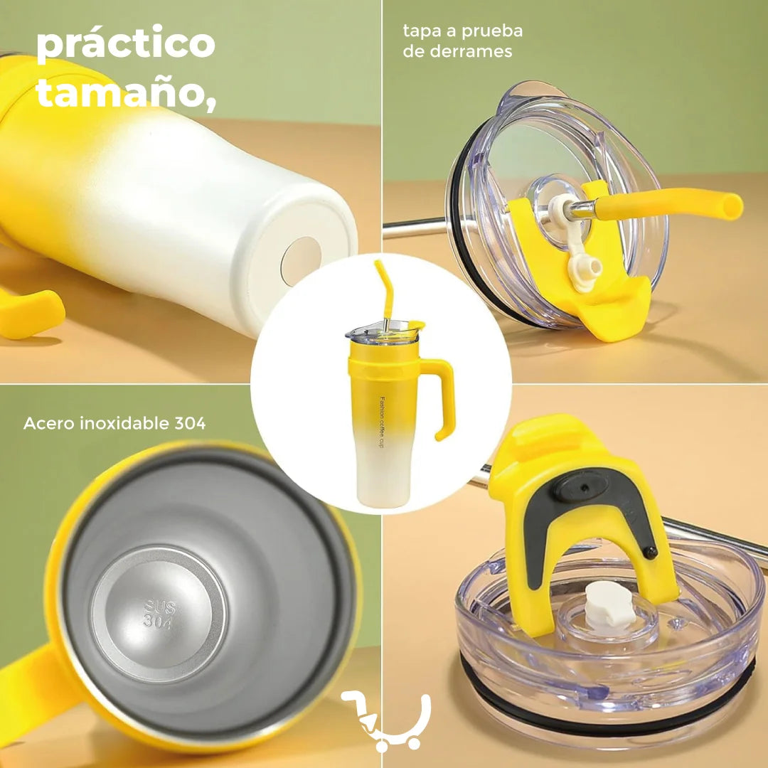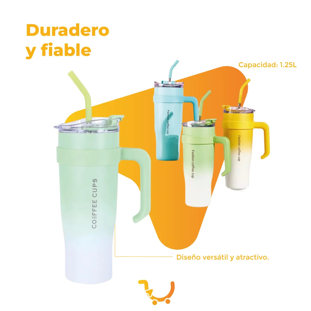 - Diseño compacto con doble pared de acero inoxidable, incluye tapa a rosca y popote desmontable de silicona, disponible en colores modernos como rojo, azul, verde y amarillo.